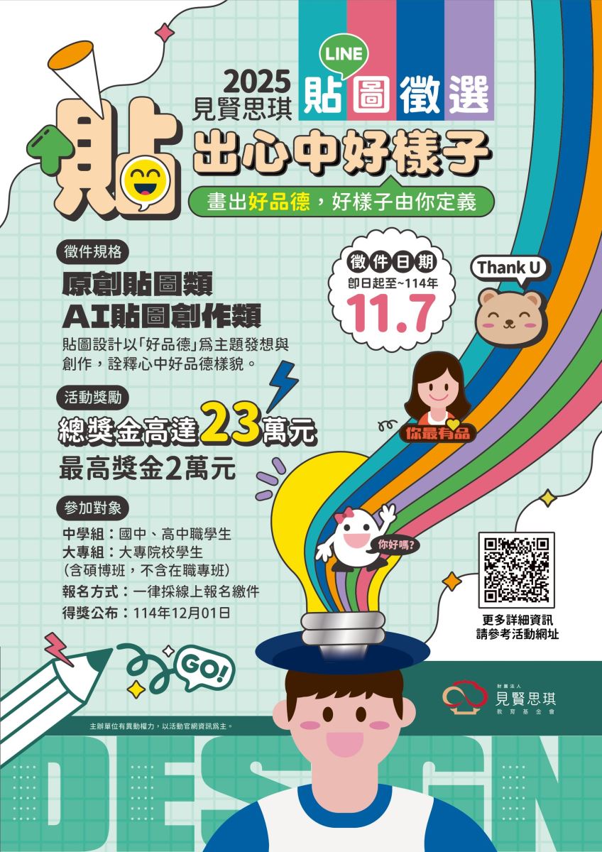 見賢思琪教育基金會辦理114年度「貼出心中好樣子」貼圖徵選活動一、本會致力於推廣品德教育,特辦理品德貼圖徵選活動,以鼓勵青少年發揮創意,提升青少年參與與實踐,進而深化品德教育理念之推廣。
