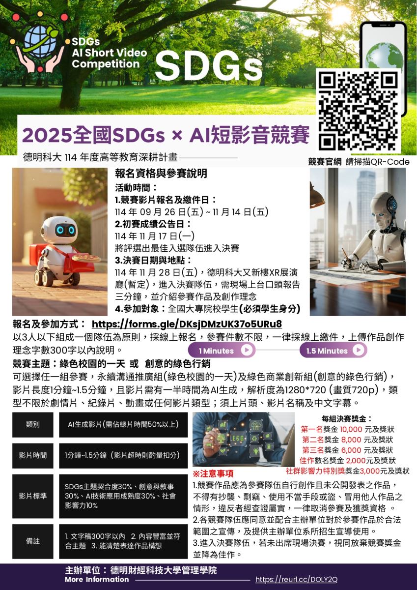德明財經科技大學辦理「2025全國大專校院SDGs×AI短影音競賽」一、活動介紹:本競賽核心為「AI短影音×永續管理」,鼓勵參賽團隊結合至少一項SDGs永續目標與管理專業知識,運用AI工具(如腳本生成、影像合成、音效設計與剪輯等),製作兼具創新性與影響力的數位影音作品,參賽團隊需擇一組別報名,並依主題方向發想創作。