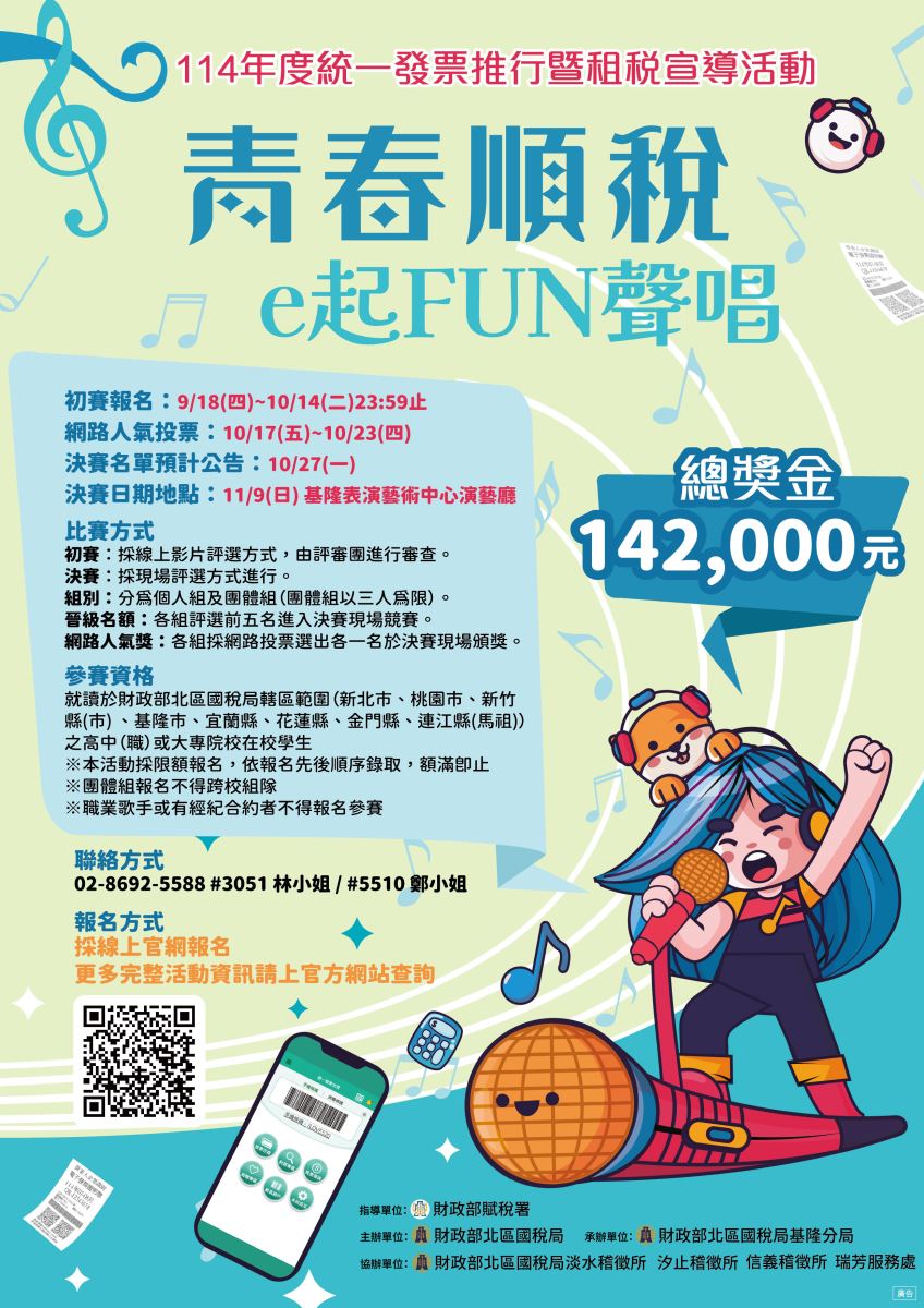 財政部北區國稅局基隆分局114年度「青春順稅e起FUN聲唱」統一發票推行及租稅宣導活動歌唱比賽一、依財政部北區國稅局及本分局114年度推行租稅教育及宣導工作計畫辦理。