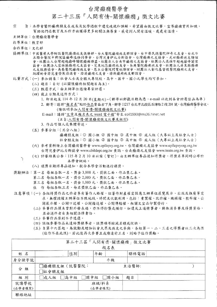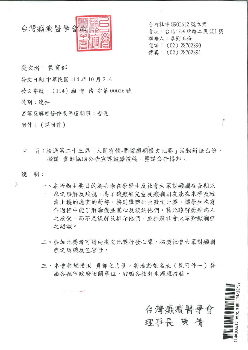 一、依台灣癲癇醫學會114年10月2日(114)癲會倩字第00026 號函(附件)辦理。