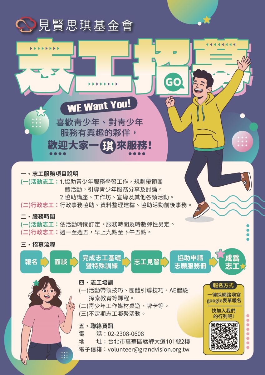 二、敬請貴校協助張貼本次志工招募海報,或公告於學校網站、臉書等社群平臺。