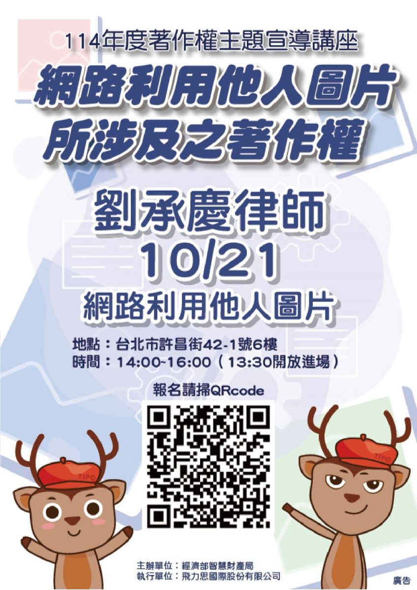 經濟部智慧財產局114年10至11月舉辦「著作權主題講座」3場次,歡迎相關有興趣者踴躍報名參加
