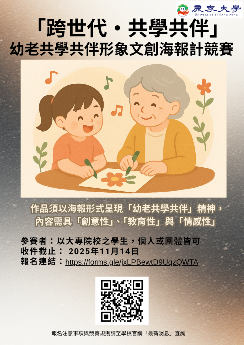 一、本競賽以「跨世代‧共學共伴」為主題,鼓勵大眾以創意 設計展現幼兒與長者共同學習、互相陪伴的溫馨畫面,傳達世代共融、互學互伴的社會價值。透過視覺設計,呈現幼老共學的教育意涵與情感連結,期望喚起社會對跨世代學習的重視,展現「陪伴即學習、共行即成長」的理念。 競賽簡章詳如附件1,競賽宣傳海報詳如附件2。